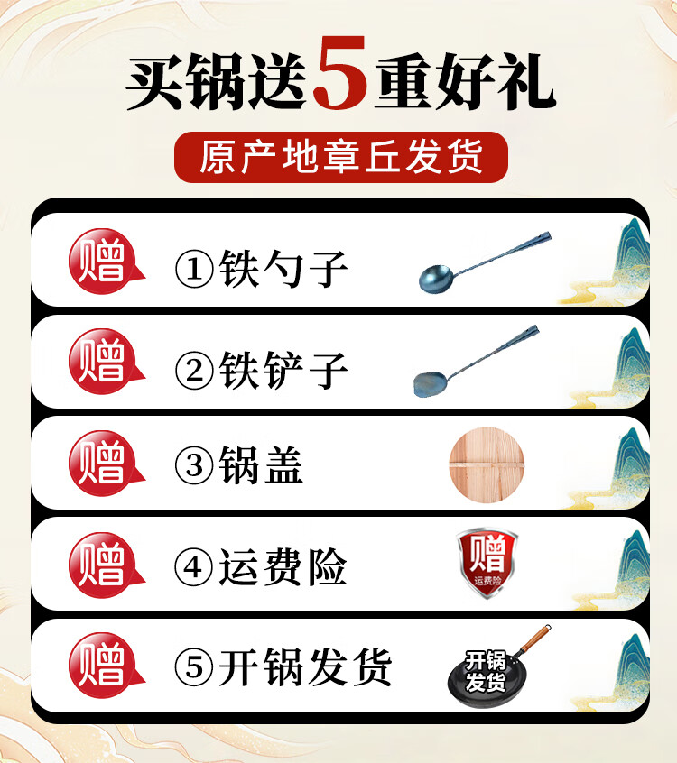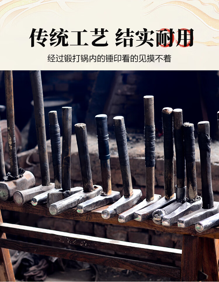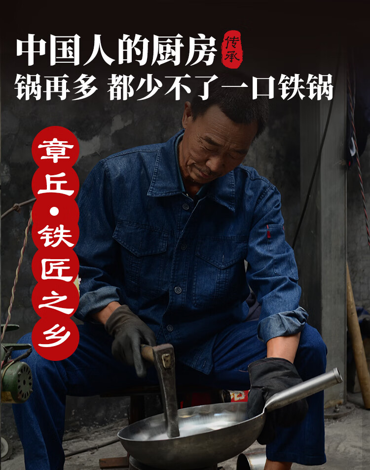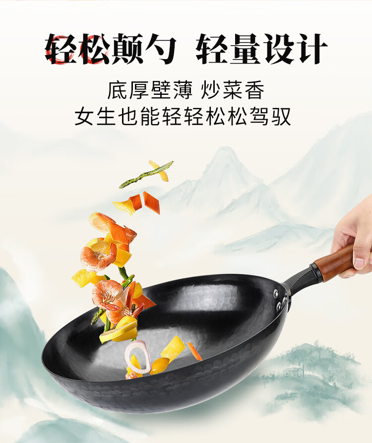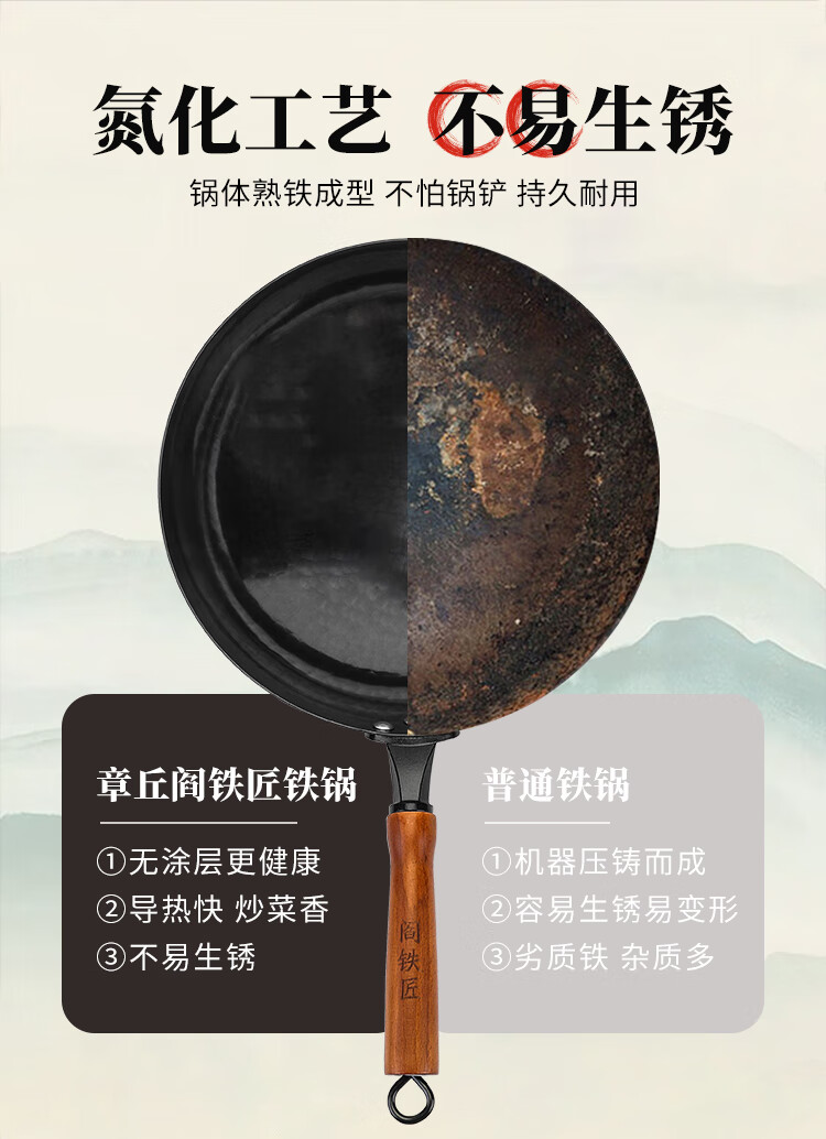 阎铁匠章丘炒锅铁锅 炒菜锅无涂层家用不易粘锅圆底轻便炒勺锻打已开锅 32cm黑锅镜面木把款3-5人D 32cm 圆底炒锅